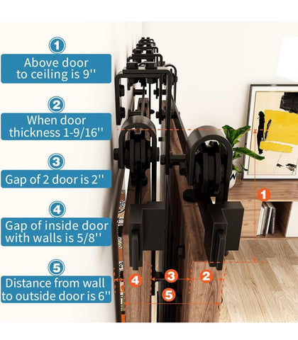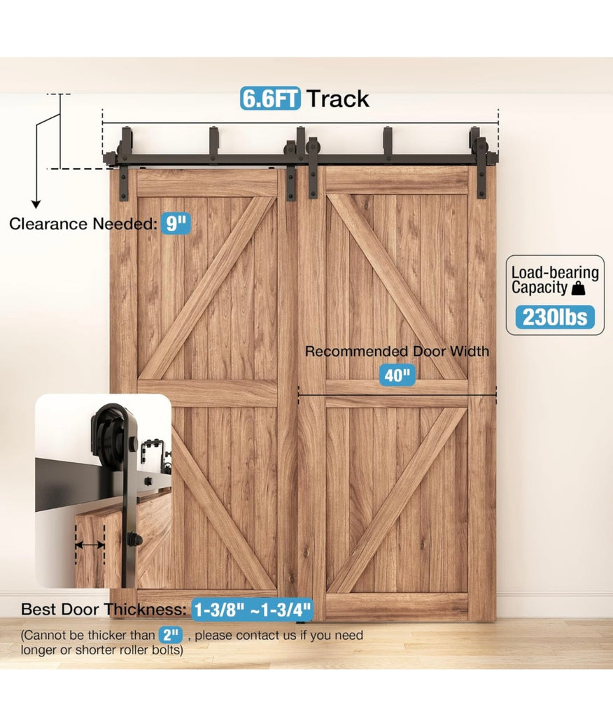 - 【Shopping Tips】Sold hardware only, doors not included. Needs at least 9" ceiling clearance to install. Doors cannot be thicker than 2" or the kit won't work. Do not install it on sheetrock walls or drywall without studs. Please let us know if you need different-length spacers or roller bolts.