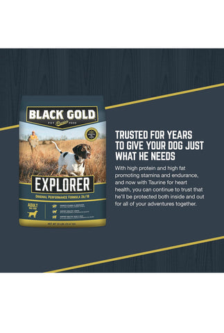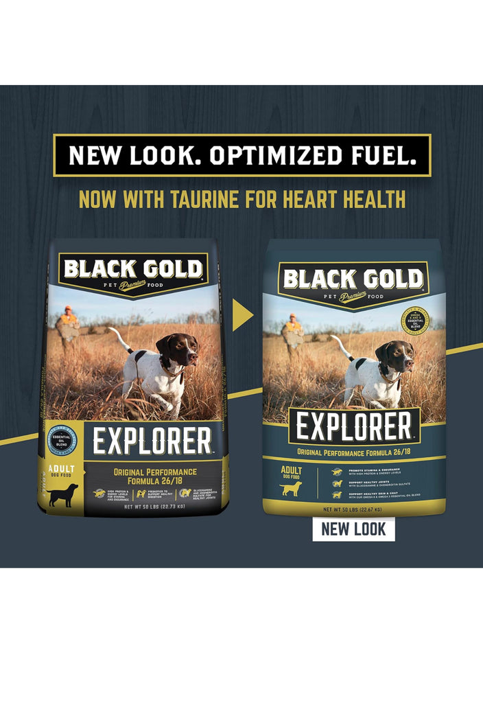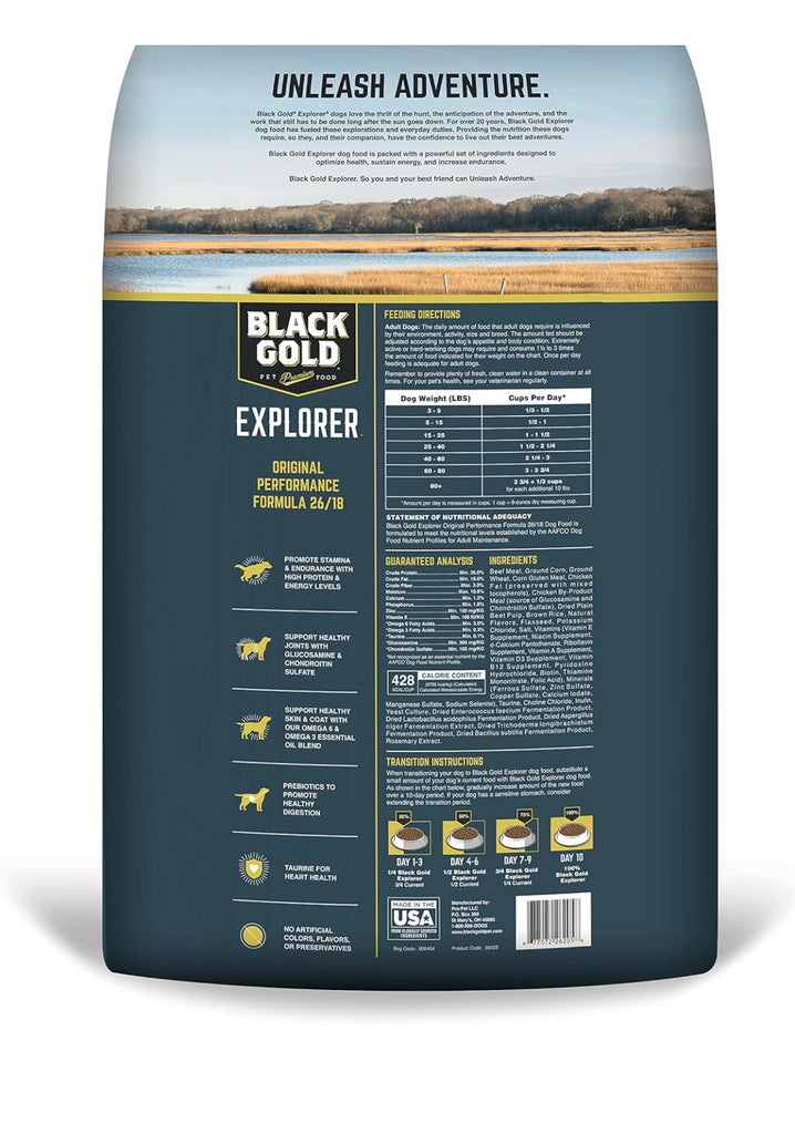 Black Gold Explorer Original Performance Formula 26/18 gives active dogs the specific nutrition they need to lead energetic lives outdoors. It is 100% complete and balanced for adult dogs and includes high levels of protein and energy for stamina and endurance.
