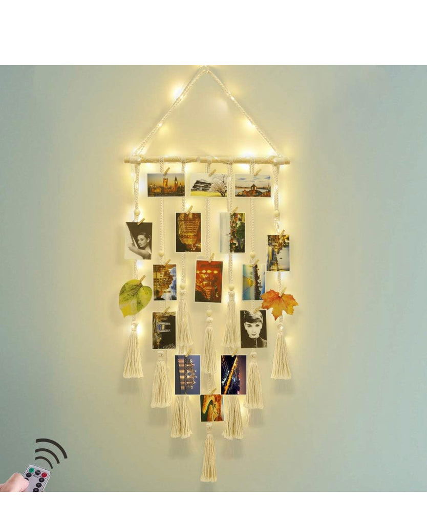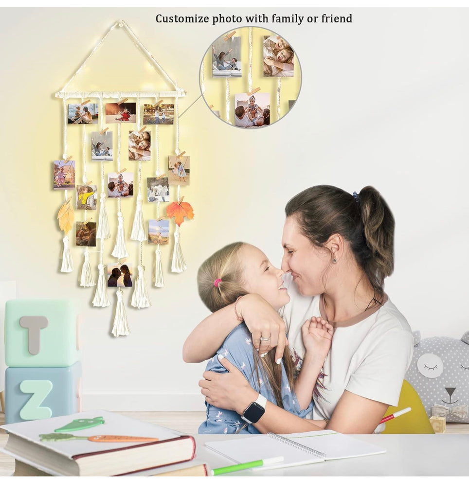 - HAND WOVEN ART: Meticulously handcrafted, sturdy, and durable. They are made of natural, high-quality cotton rope and a wooden dowel. Approx 17" Width x 32" Length (from top to the ends of the longest fringe). One row can use three 4 x 6 photos or four 2x4 photos as your family photo frames.