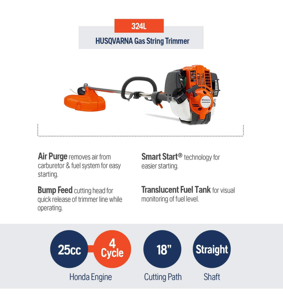 The 324L is your go to gas trimmer when you need professional grade power in an easy to use tool. This Honda powered Semi-Pro string trimmer will allow you to tackle the grass & weeds in your yd. With confidence. Our Smart start trimmer technology reduces starter cord resistance by 40% to allow for easy engine starts & the strong, braided trimmer line is ready for work. A high visibility cutting shield helps protect you from flying rocks & debris, while giving you better visibility to your cutting area. The straight shaft design provides greater reach underneath bushes & those hard to reach spots.