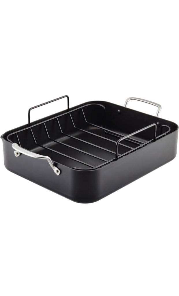 EVENLY DISPERSE HEAT: Durable roaster is crafted from hard anodized aluminum for strength and the removable nonstick rack elevates foods for better airflow, creating even heat distribution and great oven roasting