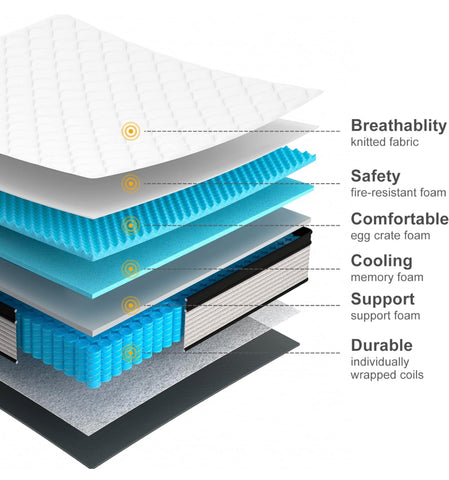 - Motion Isolation - The mattress adopted individual pocket coils and six-layer structure that maintains spinal health.The memory foam mattress also helps you maintain a proper sleeping position and distributes your weight from toe to head evenly throughout the queen mattress in a box.