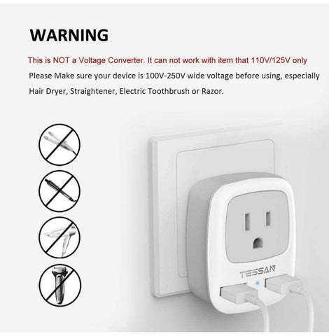 - Note: This is not a voltage converter. This travel adapter is only compatible for 100V to 250V wide voltage device, especially your hair dryer, straightener, electric toothbrush or razor need to support 100V to 250V dual voltage, otherwise you may need a power voltage converter
