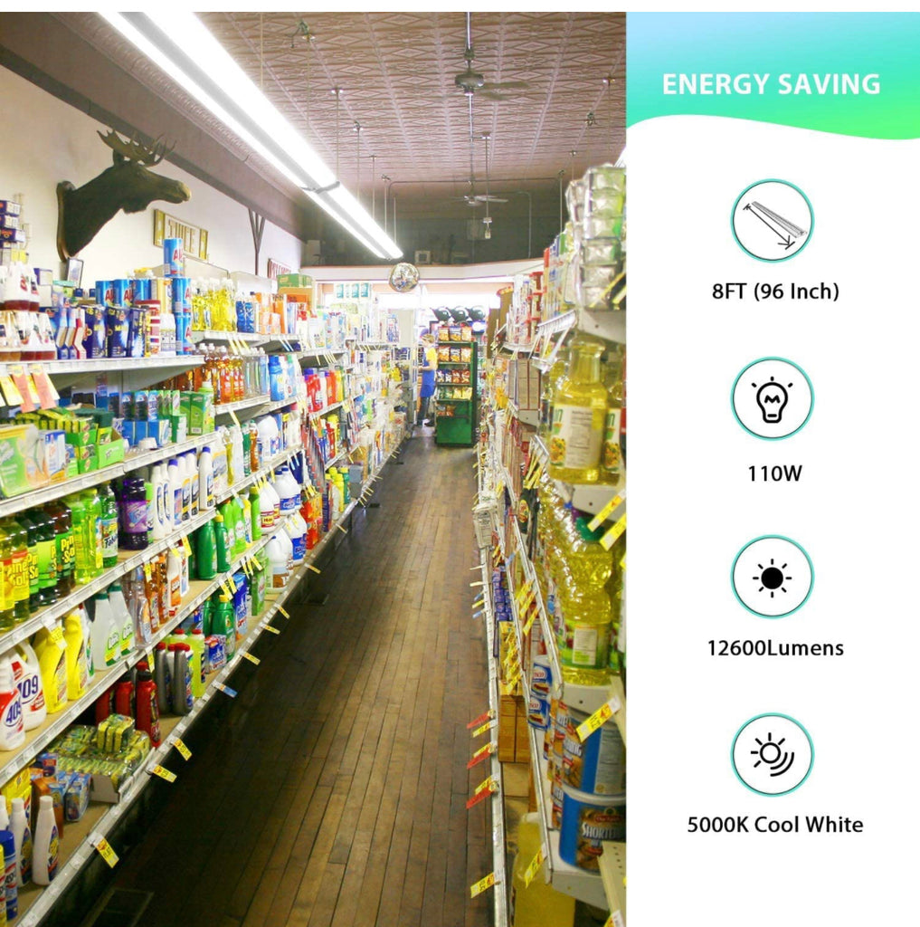 - 【SUPER BRIGHT】 SUPER BRIGHT – This 8ft led strip lights provide 12600 lumens output at 110 watts with high efficiency. Energy Savings of up to 70% electric bill instantly. Provides 50,000 hours of maintenance-free operation.